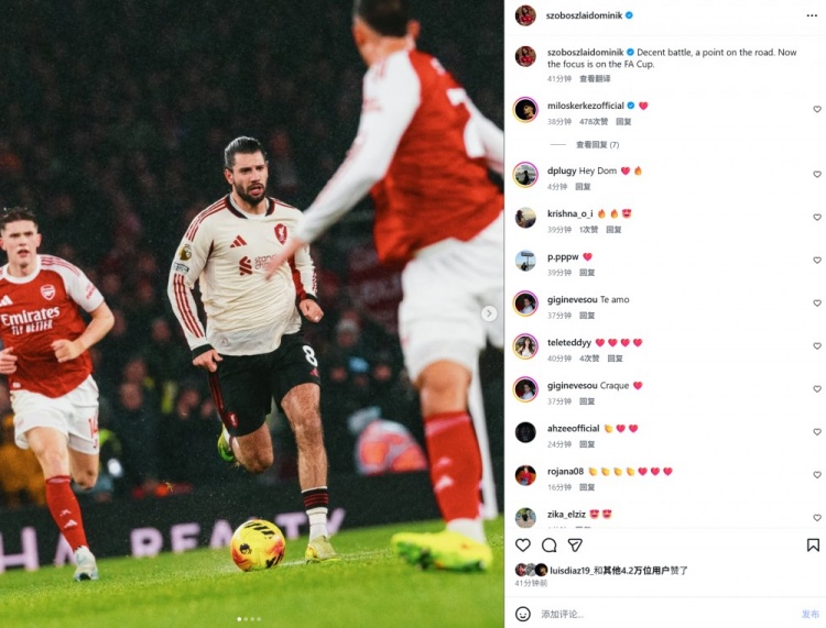 1月9日讯 在本轮英超,利物浦0-0战平阿森纳。本场比赛索博斯洛伊首发出场,赛后他也在个人社媒晒出本场照片,配文写道:“一场不错的战斗,客场之旅拿到1分。现在我们将专注于足总杯较量。”...